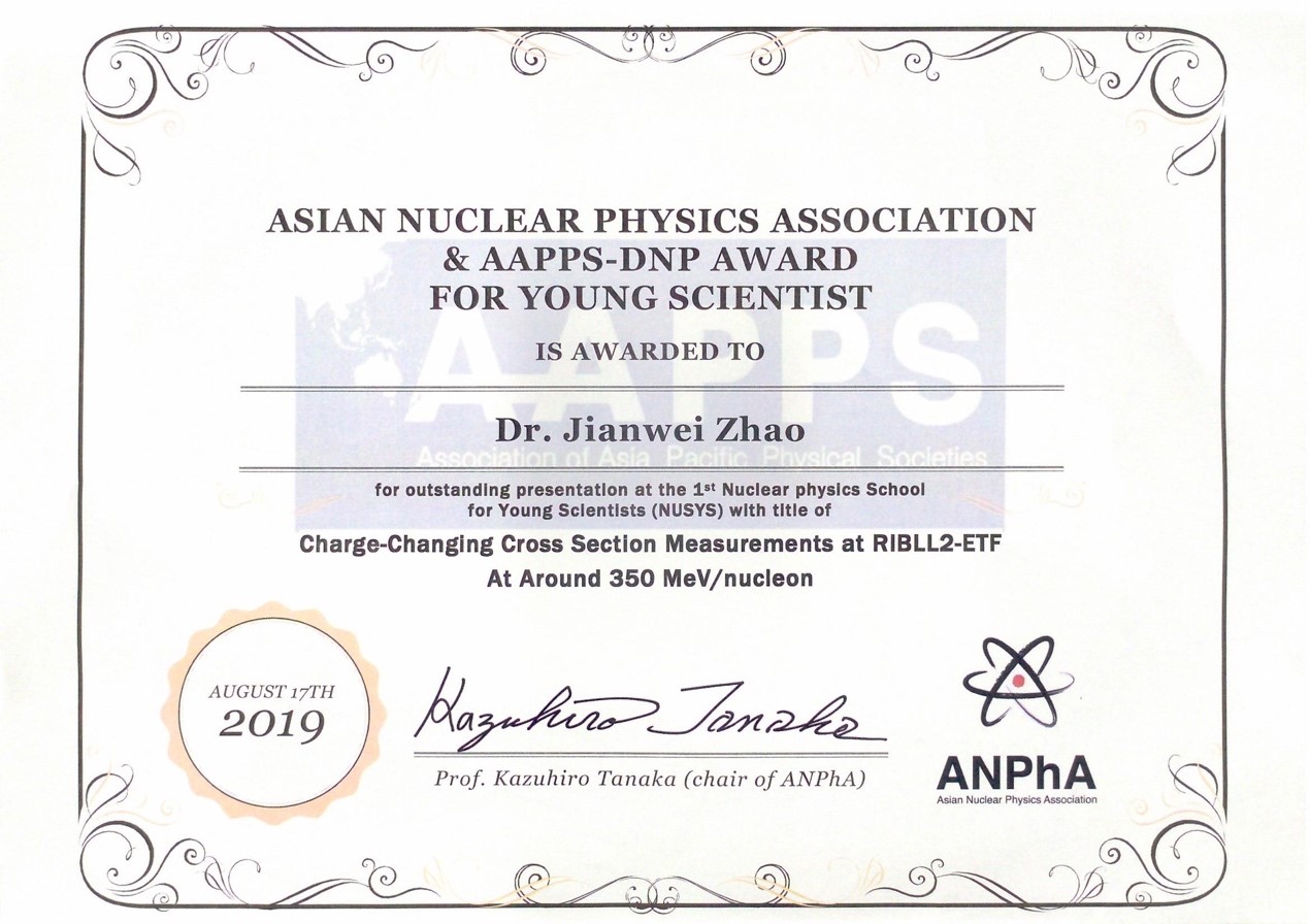 2019年8月17日,在“第一届核物理青年科学家学校(Nuclear Physics School for Young Scientists, NUSYS)”的闭幕式上,北航437437必赢国际核物理实验团队赵建伟博士因“Charge-changing cross section measurements at RIBLL2-ETF at around 350 MeV/u”的出色研究成果,获得亚洲核物理联合会(ANPhA)颁发的青年科学家奖。获得本次青年科学家奖的还有北京大学刘洋和中国原子能必赢国际院谌阳平博士。