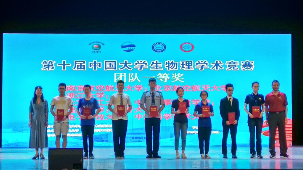 日前,第十届中国大学生物理学术竞赛(CUPT)在青岛大学举办。经过地区赛选拔,共有包括清华大学、北京大学、复旦大学、南京大学、中国科学技术大学、南开大学、437ccm必赢国际等在内的64所高校组成的65支队伍参赛,437ccm必赢国际由吕恩泽、李伟担任领队,队员王宇恒、樊迪、陈子瑞、潘越、李成栋组成的代表队在比赛中表现优异,以总成绩第5名获得团体一等奖,并被评为“最佳风采奖”。
