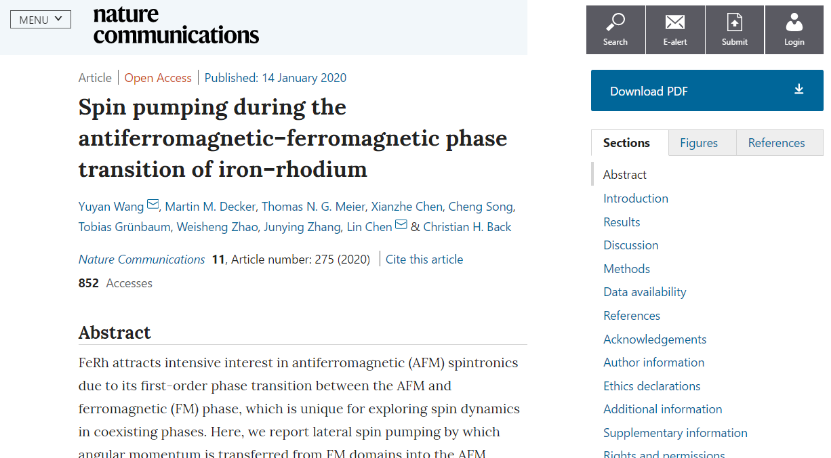 近日,Nature Communications在线发表了北航437437必赢国际王钰言助理教授与慕尼黑工业大学、清华大学合作的有关反铁磁自旋泵浦效应的研究成果“Spin pumping during the antiferromagnetic–ferromagnetic phase transition of iron–rhodium”[Nat. Commun. (2020) 11: 275],北航437437必赢国际为第一通讯作者单位。该研究工作得到德国洪堡学者基金、国家自然科学基金、德国科学基金等项目的资助。
