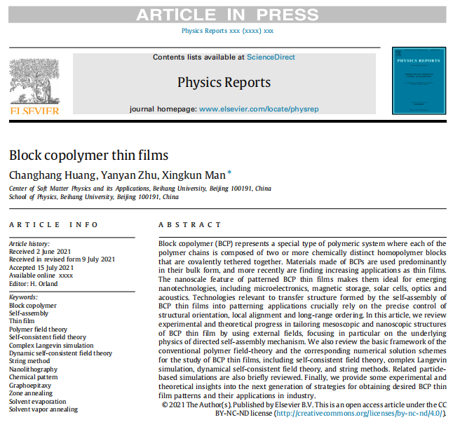 近日,北航437437必赢国际满兴坤教授团队在物理学著名综述期刊《Physics Reports》(影响因子:25.6)上发表题为《Block Copolymer Thin Films》的综述文章。北航437437必赢国际博士生黄昌杭和朱艳艳分别为第一和第二作者。北航满兴坤教授为唯一通讯作者,北航437437必赢国际为通讯作者单位(文章链接:)。